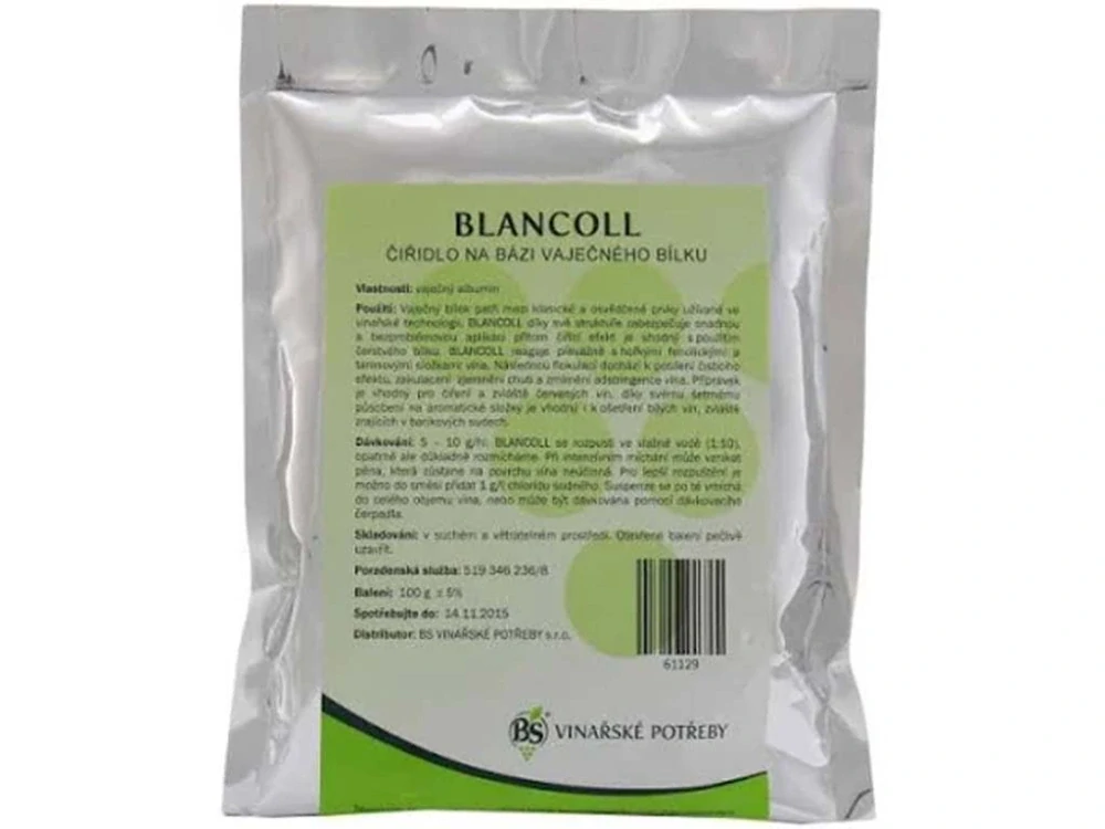 Dávkování: Pro optimální výsledky použijte 5 – 10 g na hektolitr vína. Rozpusťte potřebné množství Blancoll ve vodě, přidejte do vína a důkladně promíchejte. Nechte víno sedimentovat po dobu 2-3 dnů.