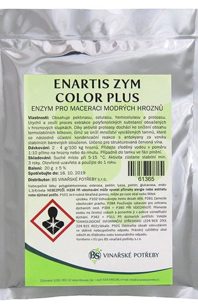 Enzym Color Plus je inovativní přípravek určený pro maceraci modrých hroznů, který výrazně zlepšuje kvalitu a stabilitu červených vín. Obsahuje směs enzymů, jako jsou pektináza, celuláza, hemiceluláza a proteáza, které efektivně urychlují extrakci polyfenolických látek z hroznových slupek. Díky těmto enzymům se snižuje množství vysrážených taninů a zvyšuje se intenzita barvy a chuti vína, což přispívá k dosažení bohatšího a komplexnějšího výsledného produktu. Tento enzym je ideální volbou pro vinaře, kteří chtějí dosáhnout špičkové kvality svých vín.